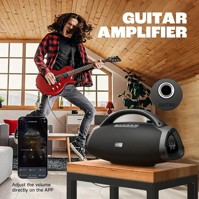 The W-KING 200W Peak Ultimate Portable Wireless Speaker is a powerful and versatile speaker designed for outdoor and party use. It features five drivers forming a 3-way system to deliver a balanced and immersive audio experience. The speaker includes APP control for easy customization, bass boost for enhanced low frequencies, and multiple connectivity options such as USB, TF card, AUX, and guitar input.