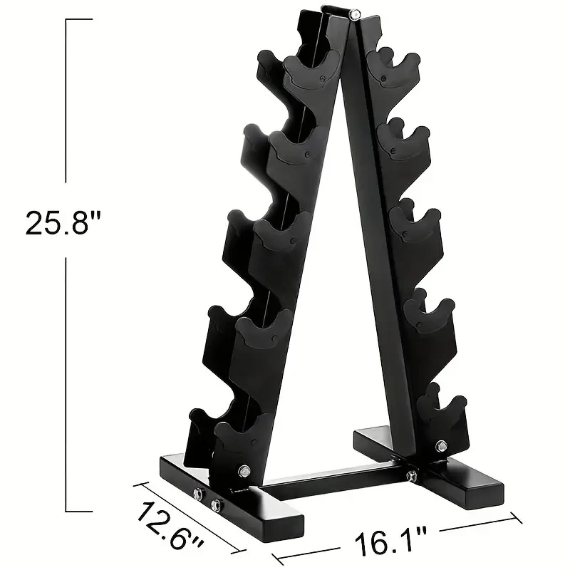 This set includes five pairs of hex dumbbells (5, 10, 15, 20, and 25 lbs) and a space-saving A-frame storage rack. The dumbbells are designed with a durable, ergonomic grip and a hexagonal shape to prevent rolling.