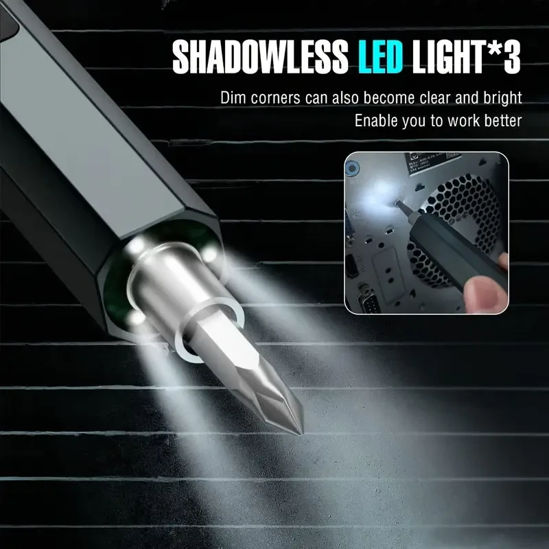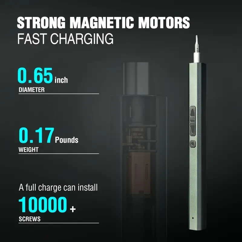 The electric screwdriver comes with LED lights to assist in locating screw holes in dimly lit areas, enhancing productivity. Additionally, it features a 320mAh built-in battery that provides up to 1 hour of continuous operation on a full charge and has a standby time of 60 days, reducing the need for frequent recharging.