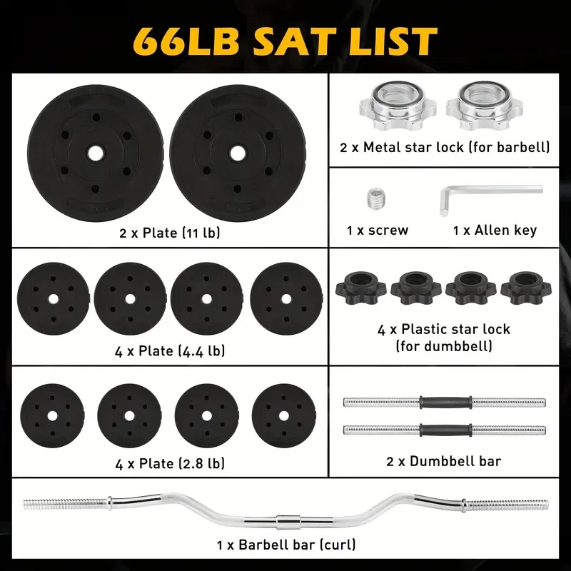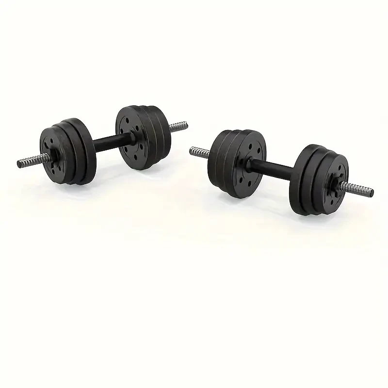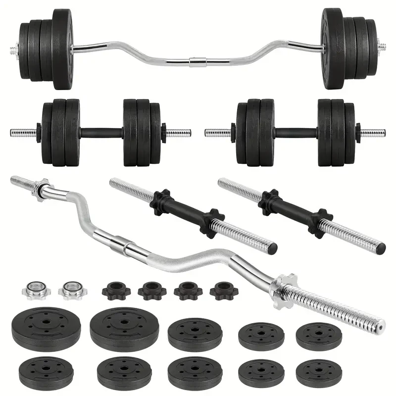 This set includes adjustable dumbbells that can be converted into a barbell using the connecting rod. It is designed for a variety of strength training exercises, making it ideal for home gyms. The set typically includes multiple weight plates, dumbbell bars, a connecting rod, and secure locking mechanisms.