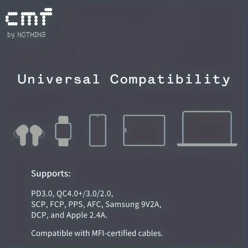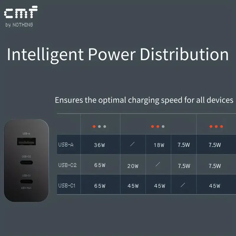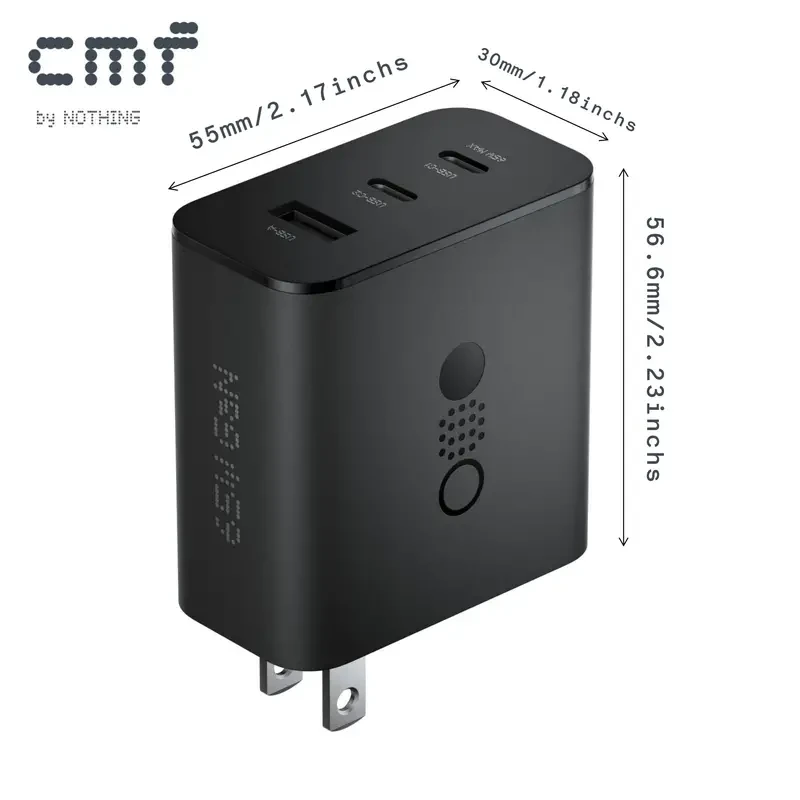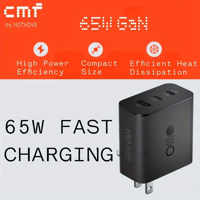 Description: Charge all your devices quickly and efficiently with the CMF by Nothing Power Charger. This 3-in-1 65W GaN Type C charger is designed to provide ultra-fast charging while ensuring safety and compatibility with a wide range of devices.