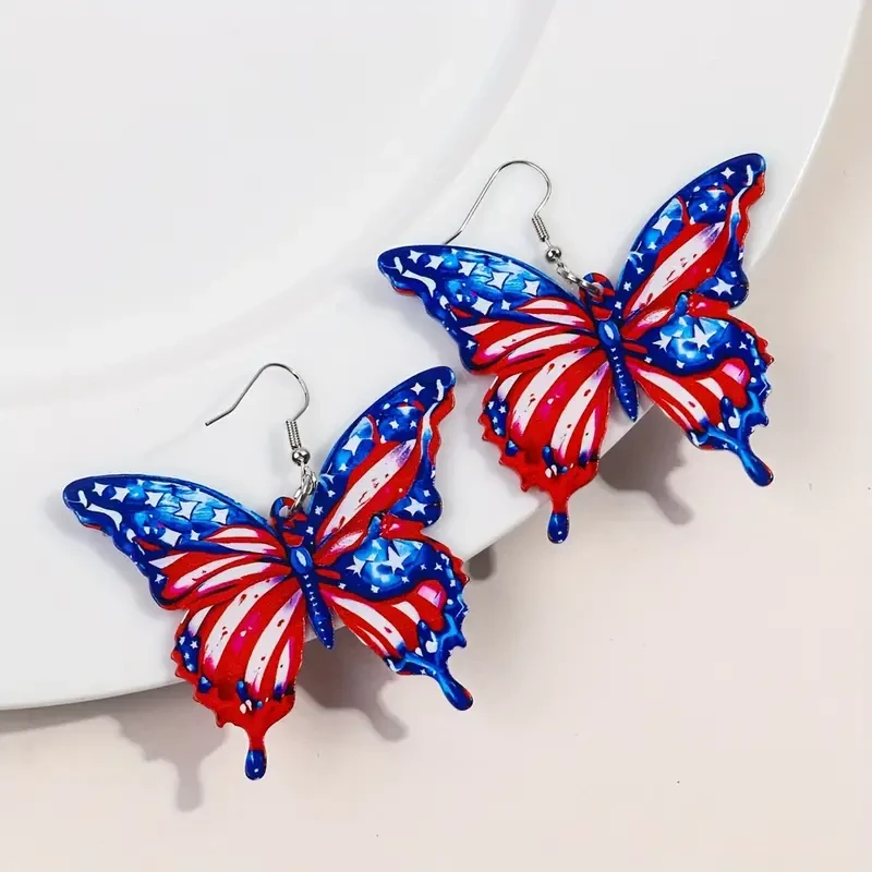 These earrings feature a striking butterfly design adorned with the American flag's colors and patterns. The vibrant red, white, and blue hues, combined with star and stripe details, make them a perfect accessory for patriotic occasions or to show national pride. Made with attention to detail, they hang from standard earring hooks, offering both style and ease of wear.