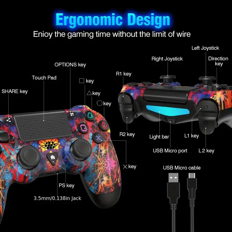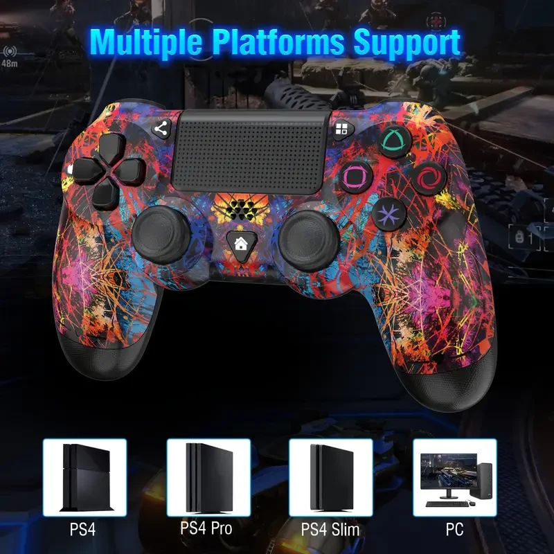 Discover our unique and ergonomic PS4 controller, perfect for all passionate gamers. With its vibrant artistic pattern, this controller stands out and adds a touch of style to your gaming sessions.
