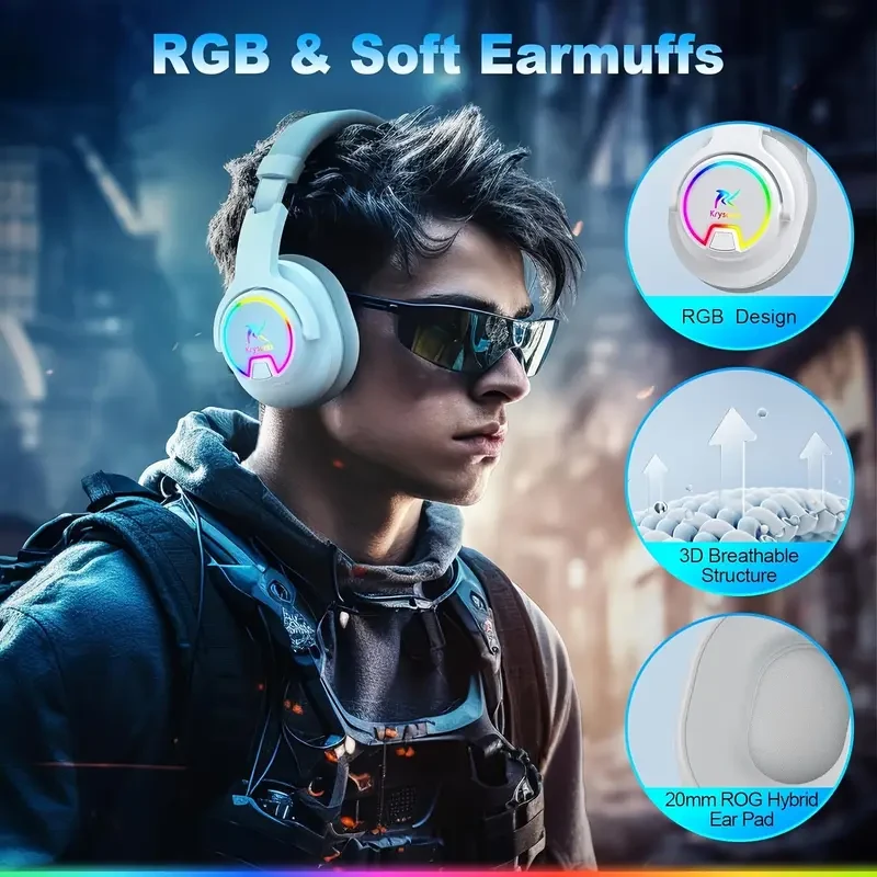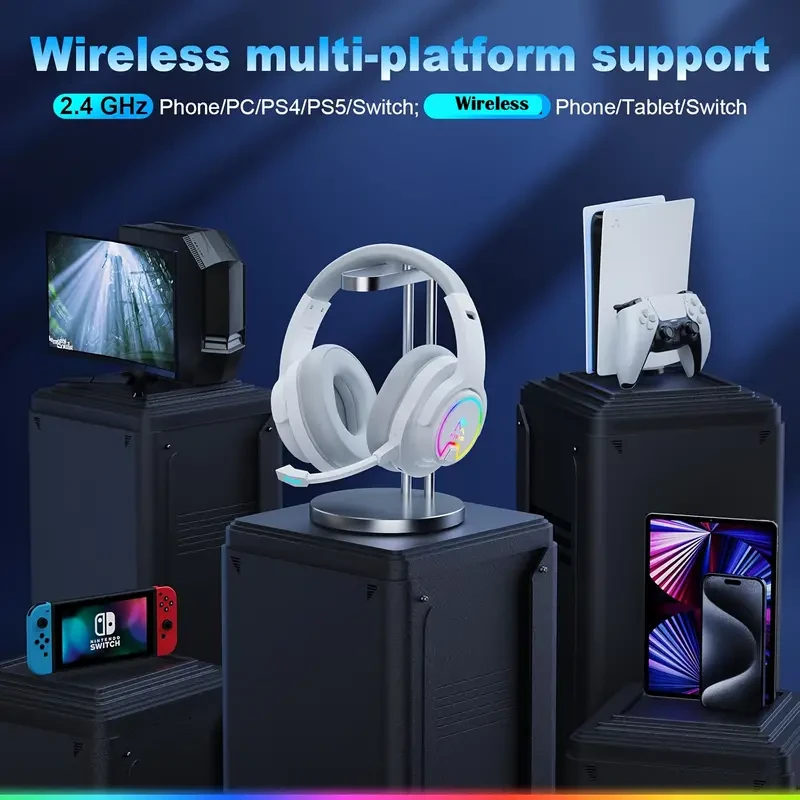 This wireless gaming headset is designed for immersive gaming experiences across multiple platforms, including PS4, PS5, PC, laptops, Switch, and Mac. It features a sleek, modern design with comfortable over-ear cups and an adjustable headband for extended gaming sessions.